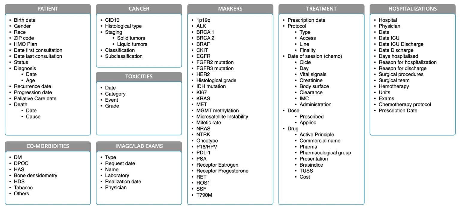 Criamos um abrangente banco de dados em oncologia que atualmente possui dados de mais de 15.000 pacientes, compreendendo mais de 185.000 registros de saúde multidisciplinares e incluindo mais de 150.000 prescrições de protocolos de tratamento. Esses números impressionantes não apenas demonstram nossos esforços abrangentes de coleta de dados, mas também destacam o potencial para obter insights profundos a partir dessa riqueza de informações.